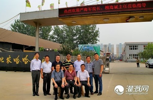 圖為6月5日,中國農業大學水利與土木工程學院嚴海軍院長、國家半干旱中心節水部主任檀海斌、副主任張愛習、灌溉網總經理劉洋受農哈哈集團公司田園分公司張學謙經理邀請到訪河北農哈哈機械集團合影照片。